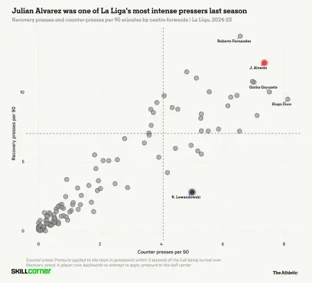 ფოტოზე ხედავთ ფორვარდების მაჩვენებლებს პრესინგში - ალვარესი მეორეზეა (წითელი წერტილი) ლევანდოვსკი გაცილებით ქვემოთ არის (შავი წერტილი)